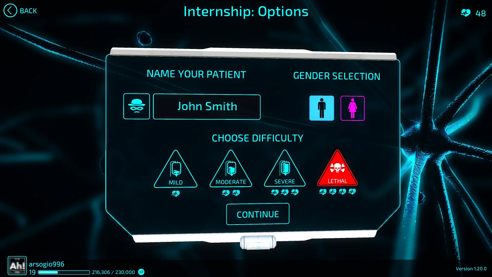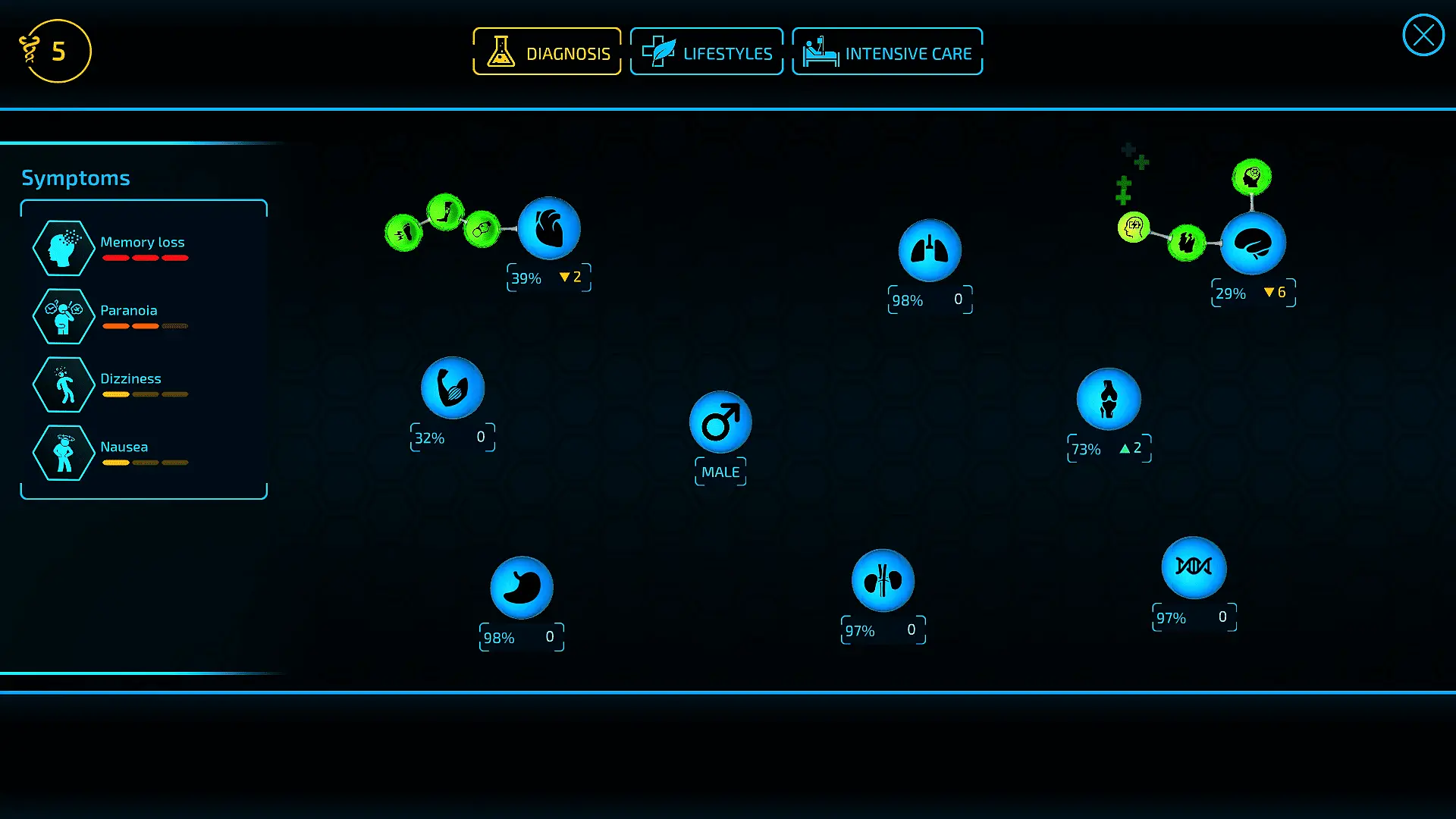 By that same respect the game has no defined setting. Players are presented with their patient in a void and they can switch between views of different biological system; nervous, digestive, skeletal, etc. The interface is very detailed showing symptoms as diseases and the patient's status changes. There’s no linear narrative; instead, each of two campaigns consists of nine self-contained “cases”; mini-stories,